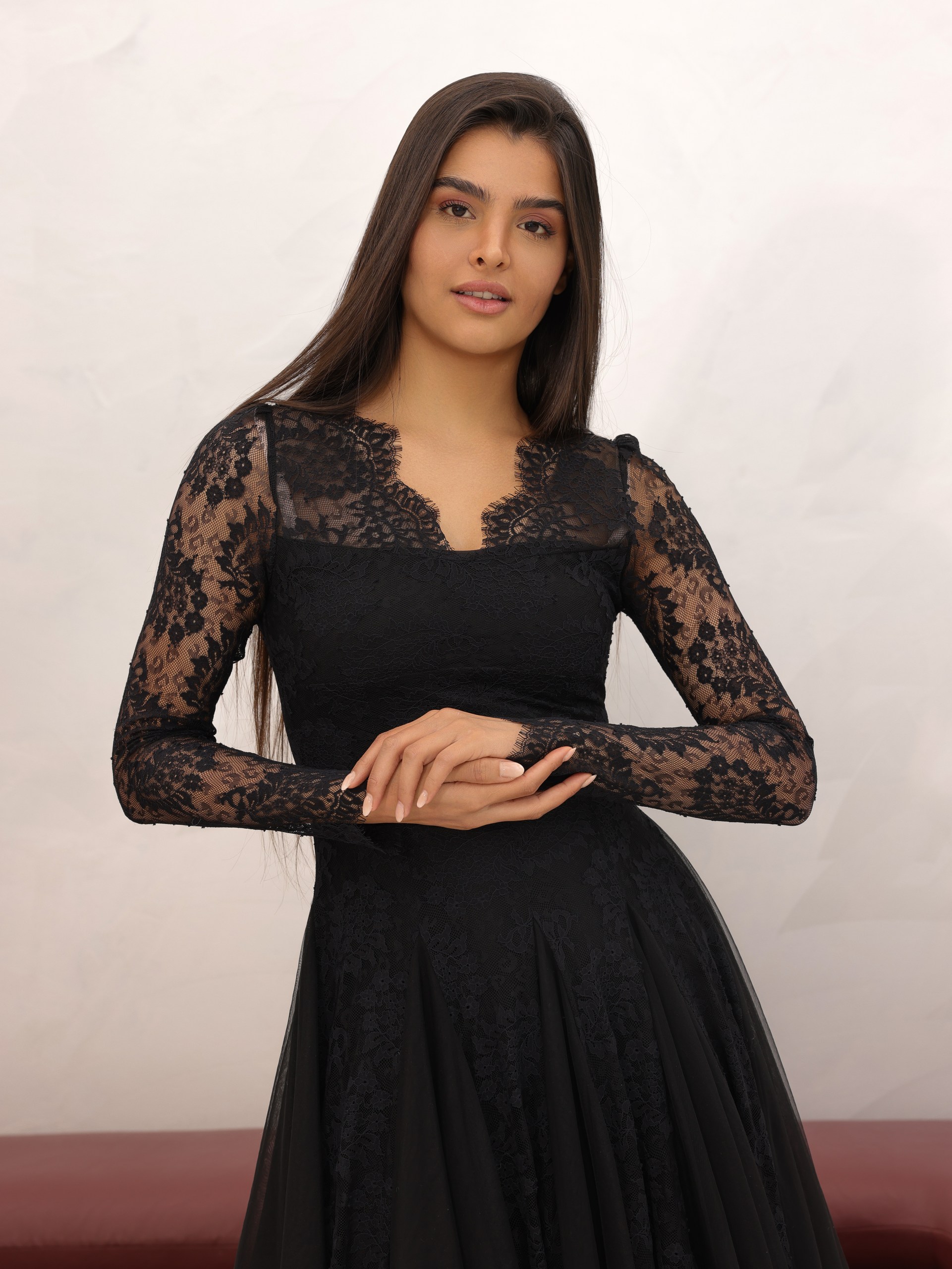 فستان أسود أنيق بتصميم راقٍ يجمع بين الدانتيل الناعم والتول الفخم، بقصّة تبرز الخصر وتمنح إطلالة أنثوية فخمة. يتميز بتفاصيل الدانتيل على الأكمام والصدر لتضيف لمسة فخامة وسحر خاص، مثالي للمناسبات والسهرات الراقية