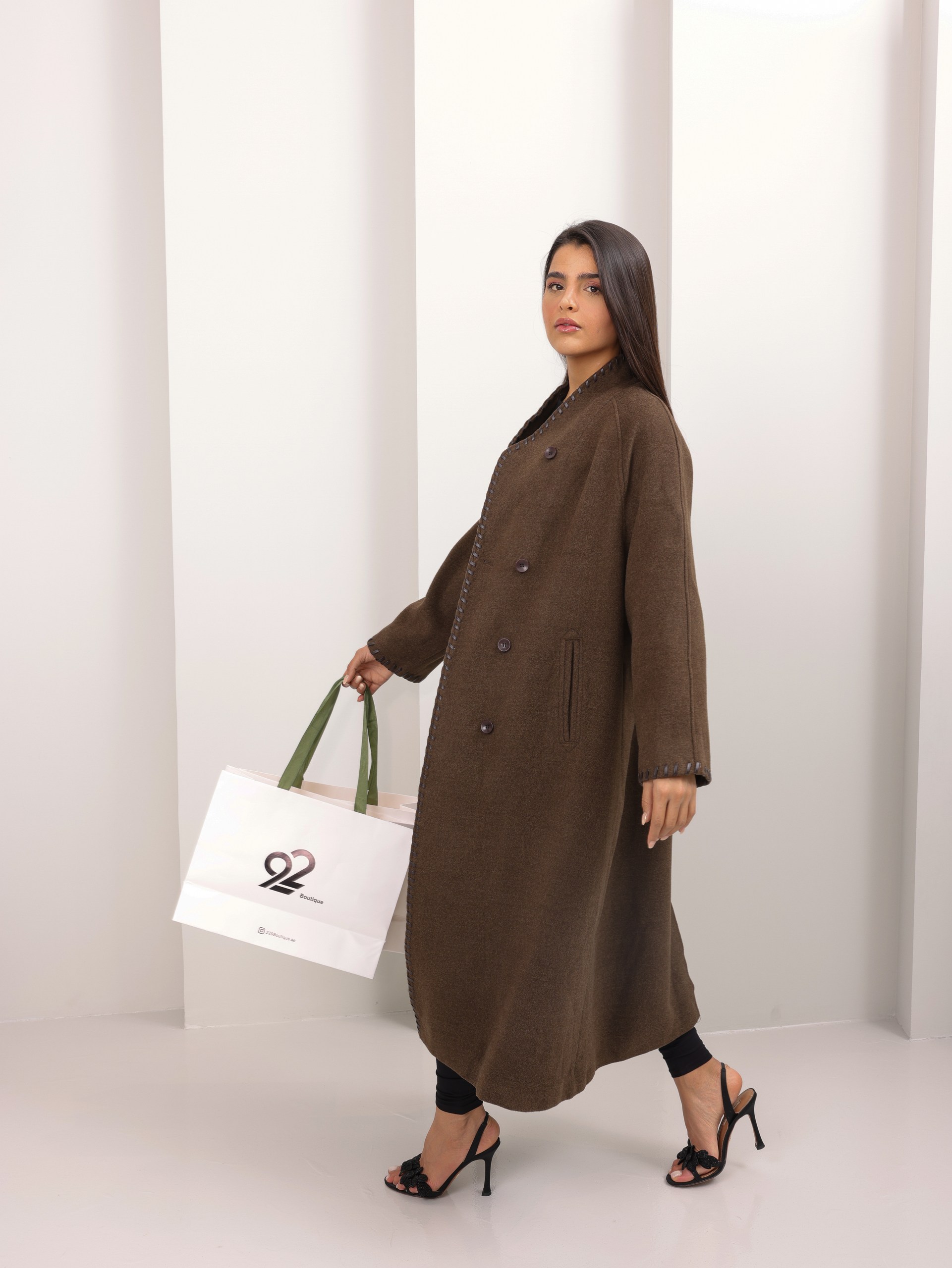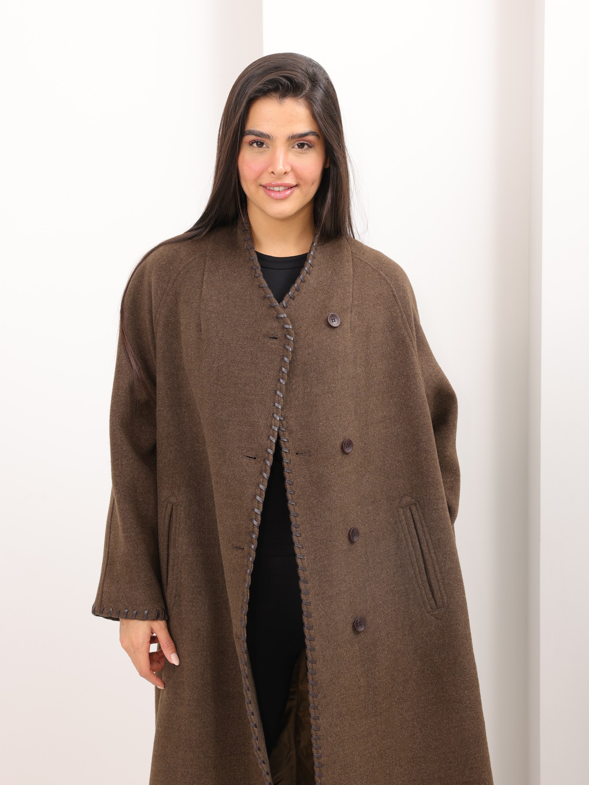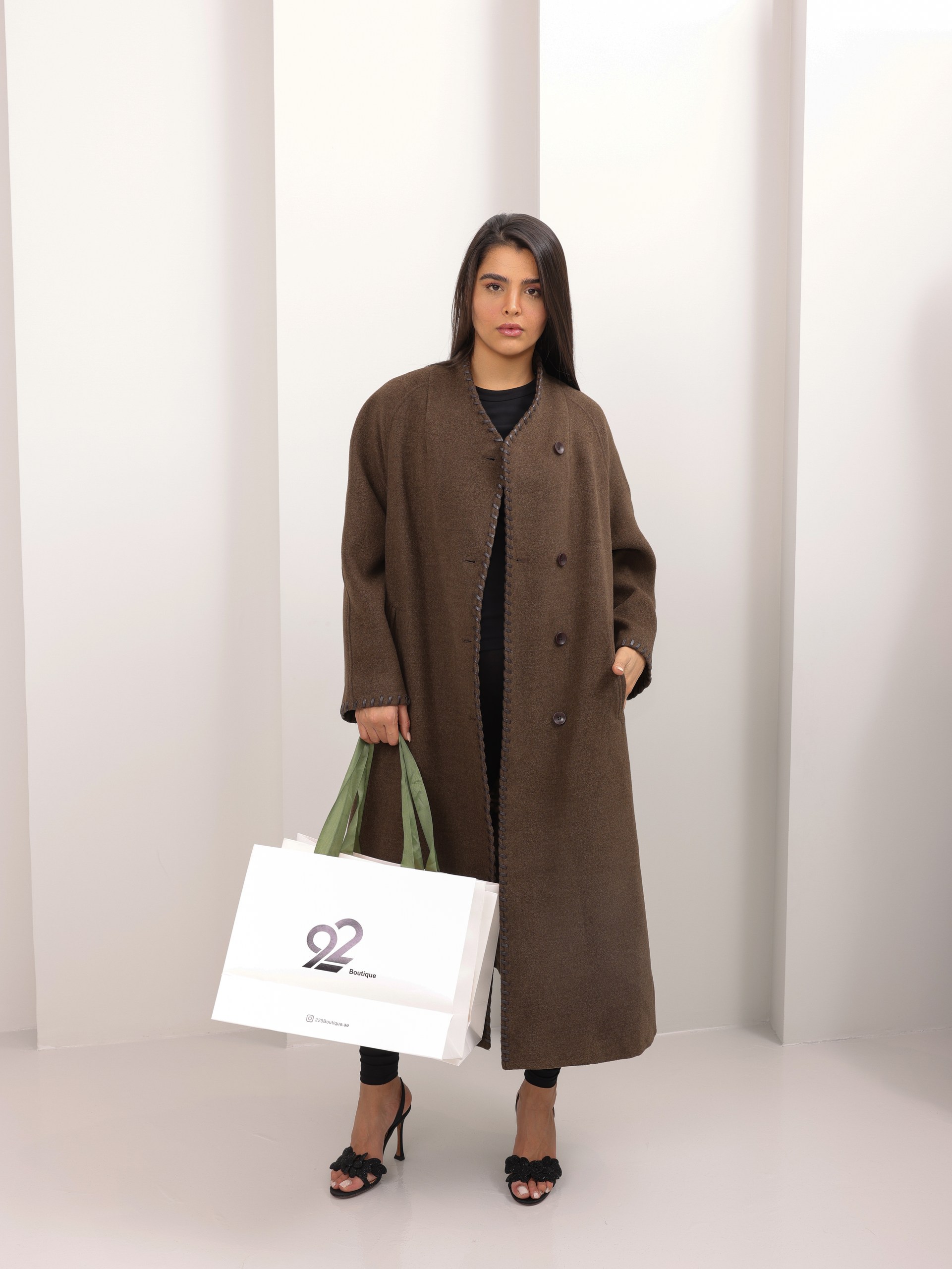 جاكيت شتوي فاخر بلون بني كلاسيكي، يتميز بتصميم أنيق يجمع بين البساطة والفخامة. أزراره الأمامية وتفاصيل الخياطة البارزة على الحواف تضيف لمسة عصرية راقية، بينما خامته الدافئة توفر راحة وأناقة مثالية لأيام الشتاء