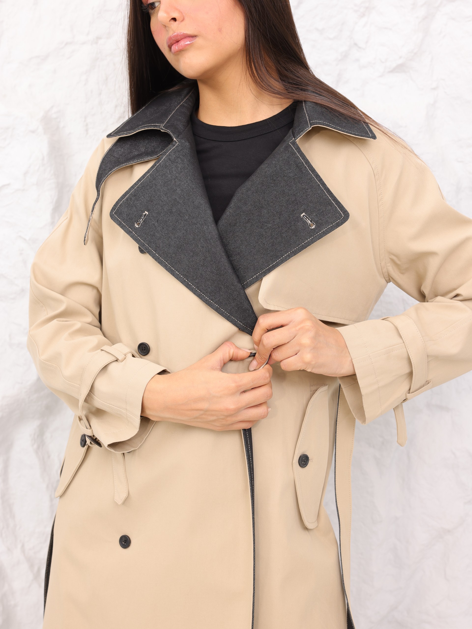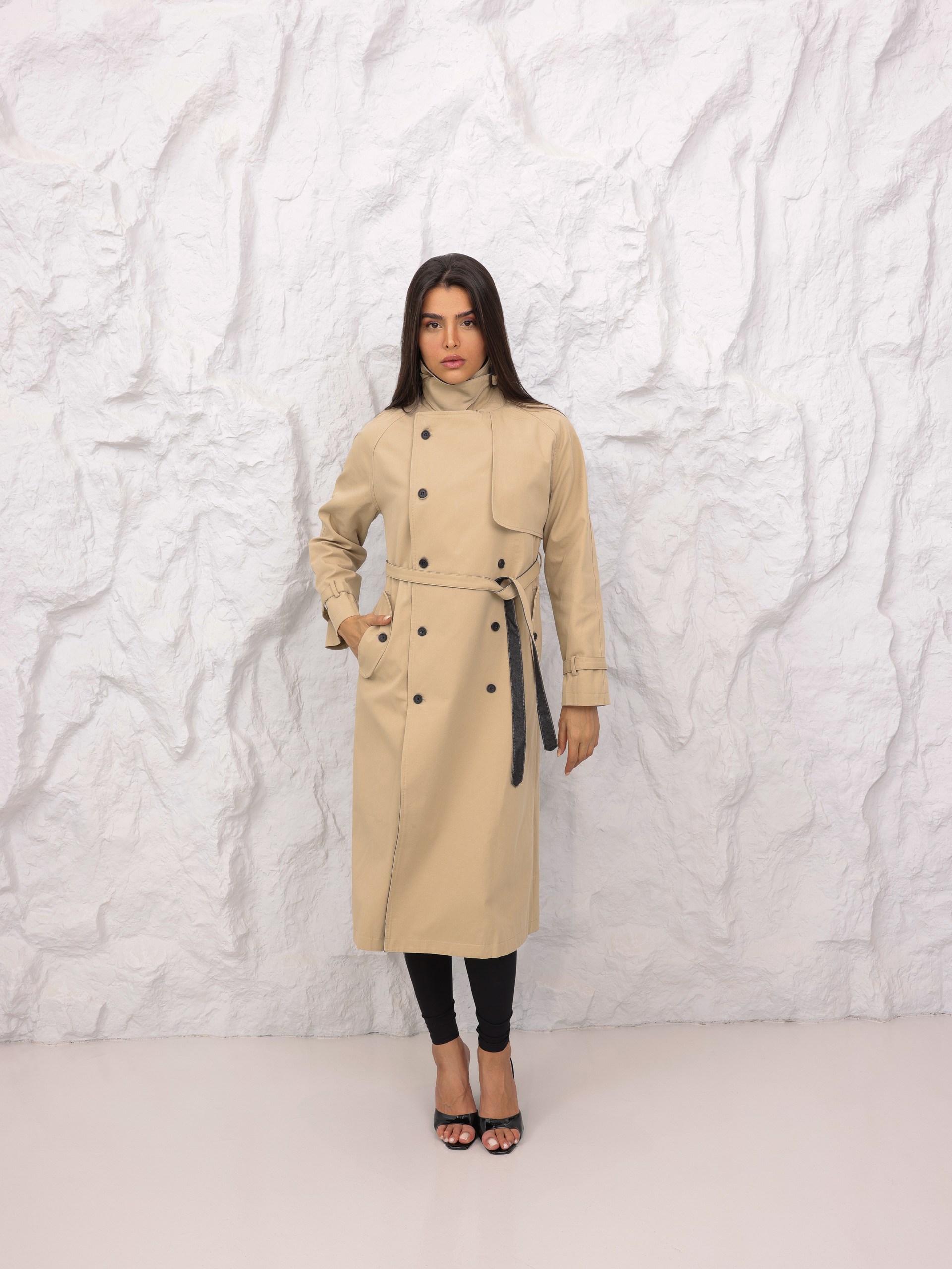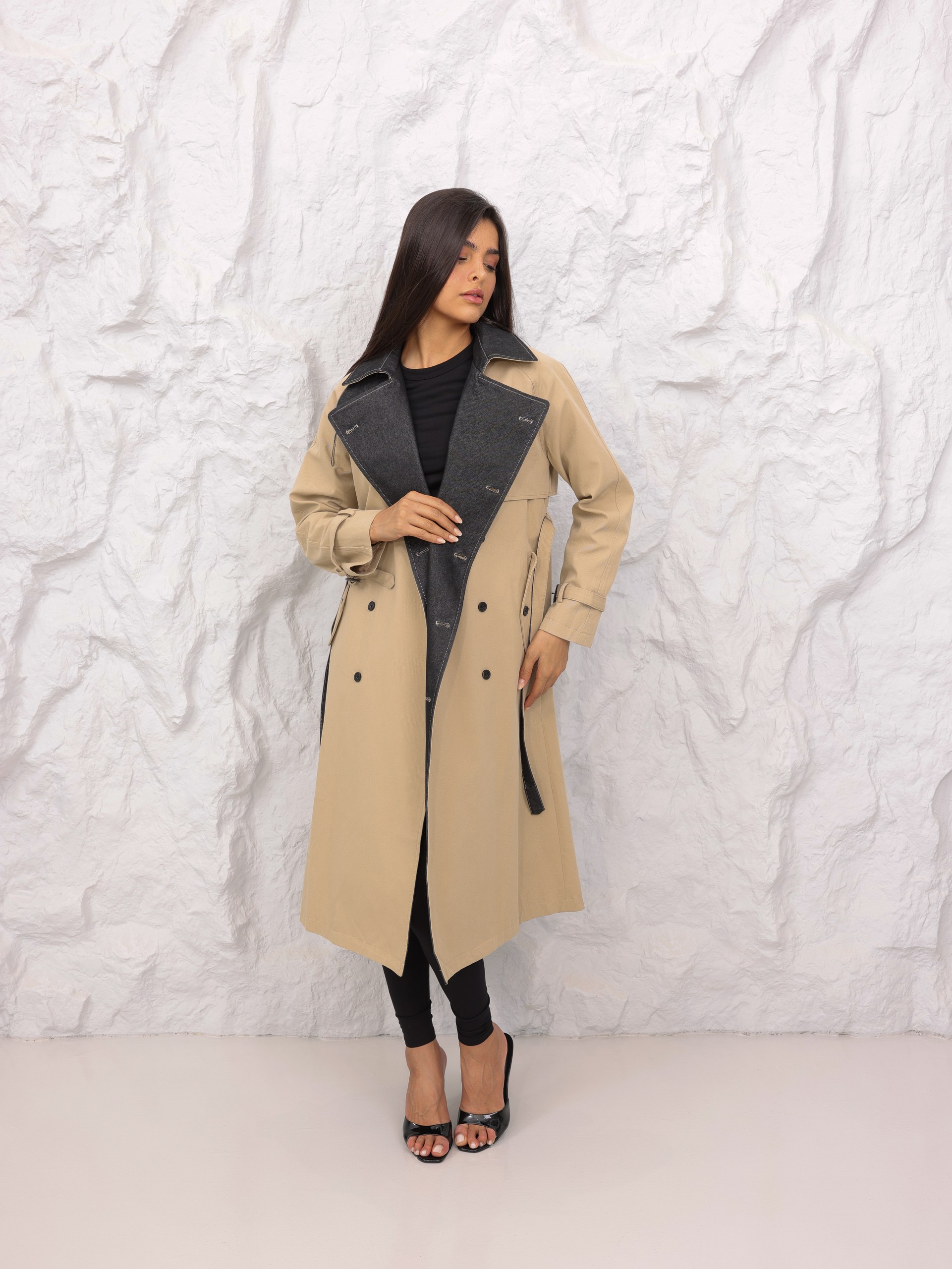 جاكيت طويل بتصميم ترنش كلاسيكي فاخر بلون بيج أنيق مع تفاصيل داخلية بدرجات رمادية داكنة تضيف لمسة عصرية مميزة. يتميز بأزرار مزدوجة وحزام على الخصر يمنح إطلالة راقية ومتناسقة