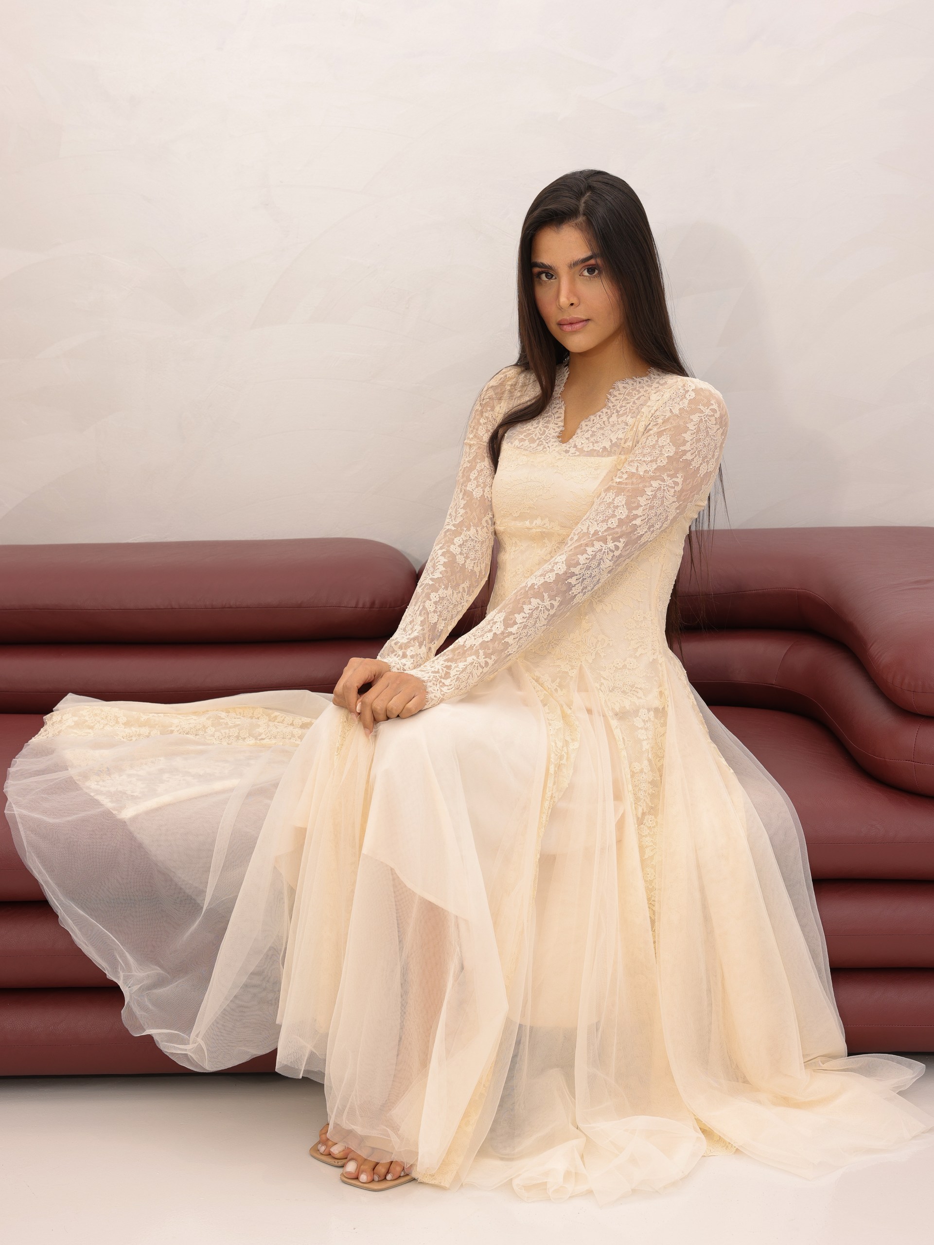 فستان فخم بلون المشمشي الفاتح، مصنوع من دانتيل فاخر وتول ناعم بتصميم يبرز الخصر ويمنح إطلالة أنثوية راقية. تفاصيل الدانتيل على الأكمام والصدر تضيف لمسة فخامة ناعمة