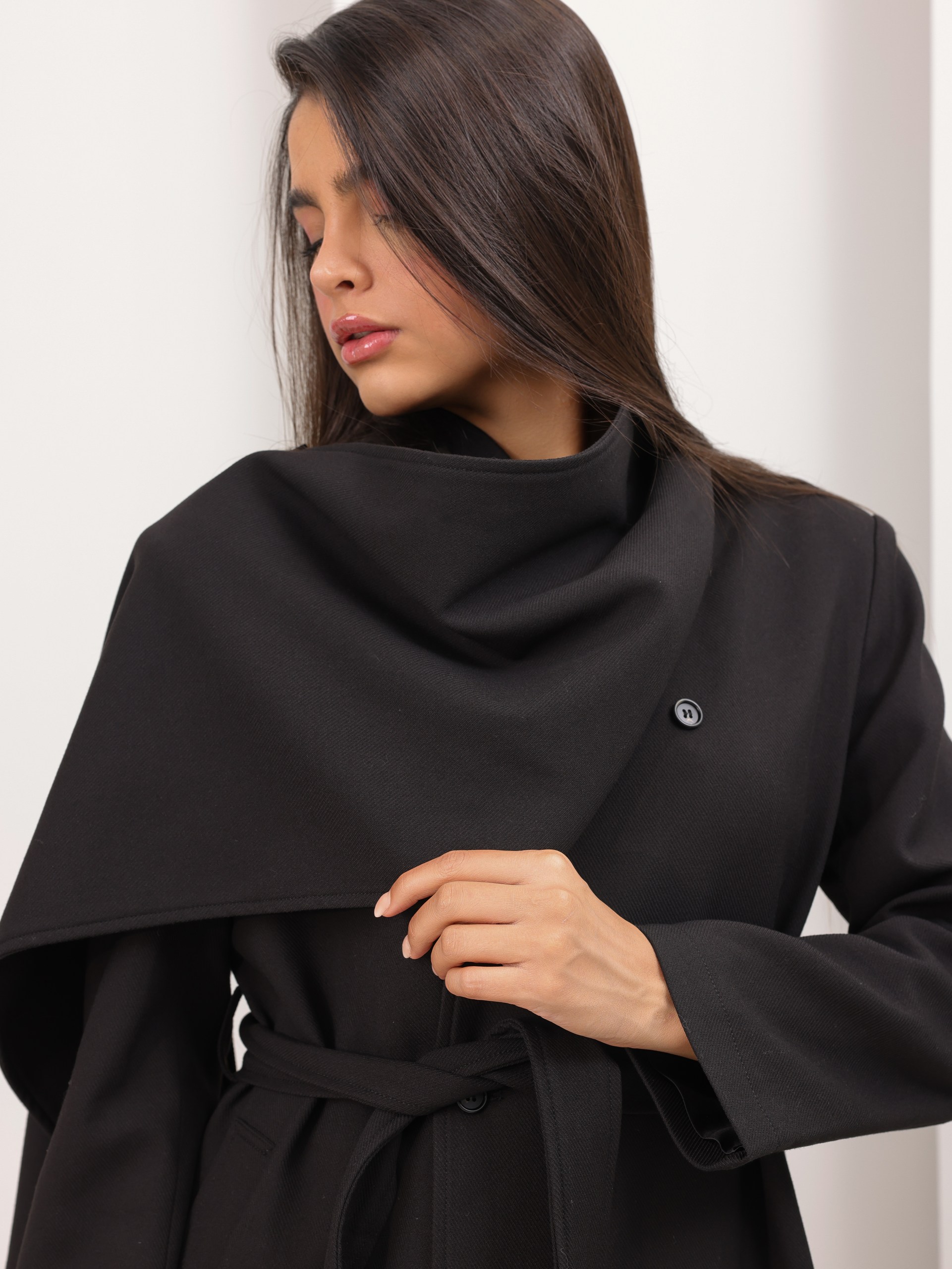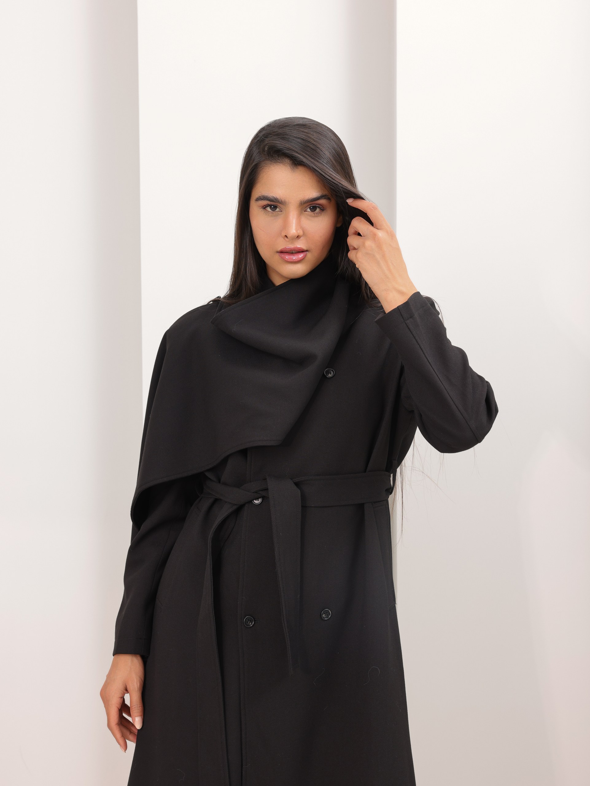 جاكيت شتوي فخم بلون أسود كلاسيكي بتصميم أنيق يعكس الذوق الراقي. يتميز بقصة طويلة مع حزام على الخصر لإبراز القوام بأسلوب أنثوي راقٍ، إضافة إلى تفاصيل أنيقة في الياقة تمنحه لمسة فخامة مميزة. خامته دافئة ومريحة، مثالية لأيام الشتاء الباردة