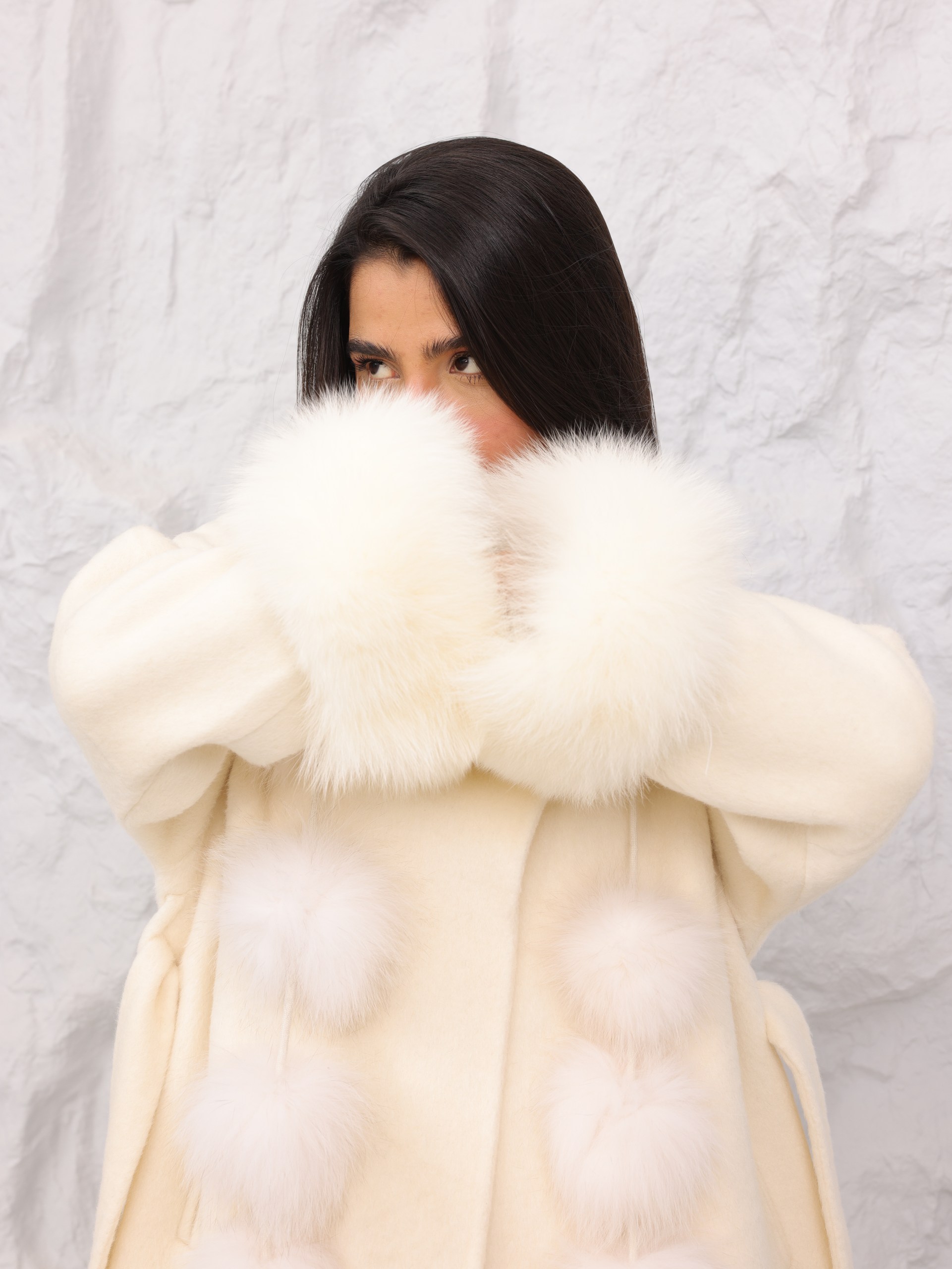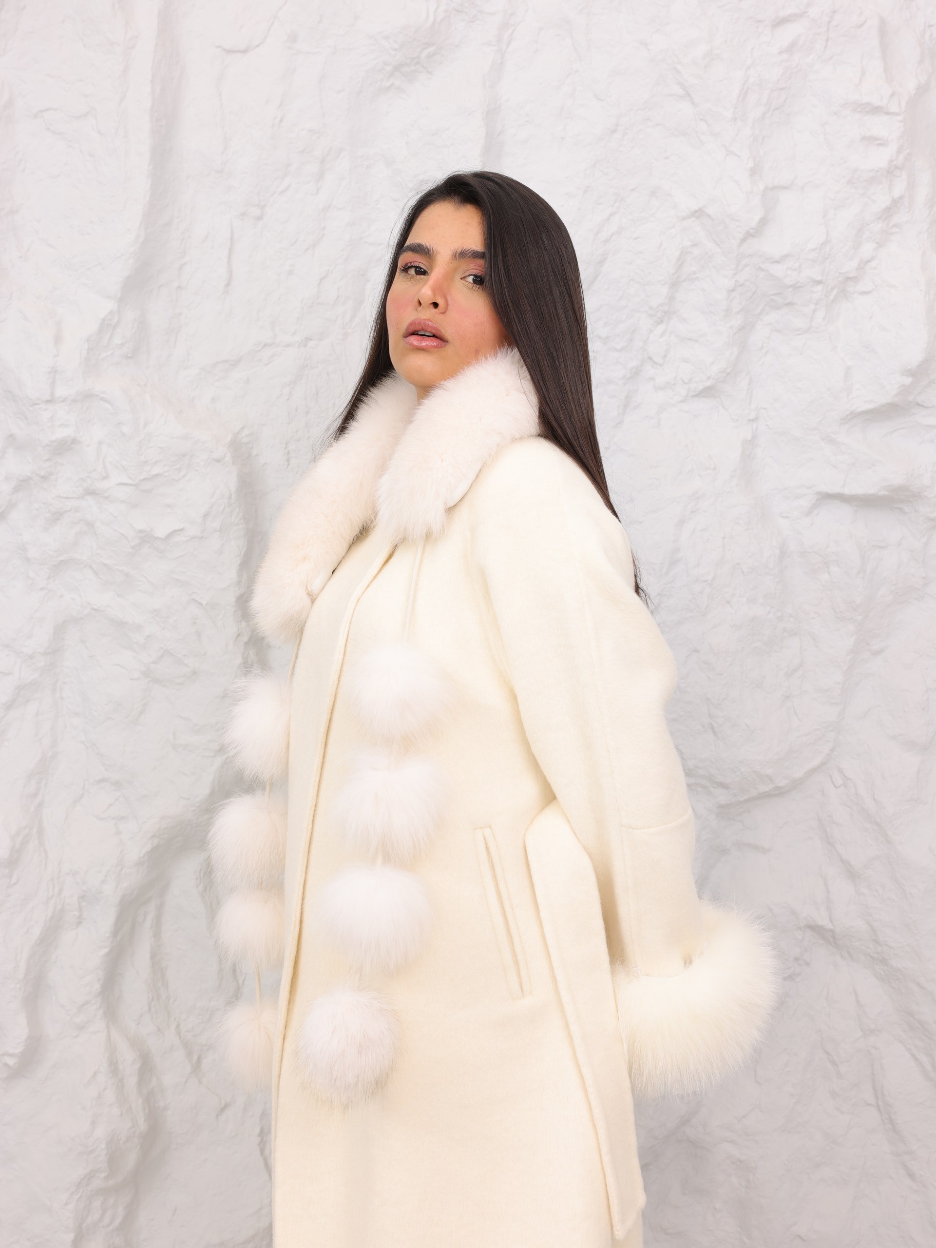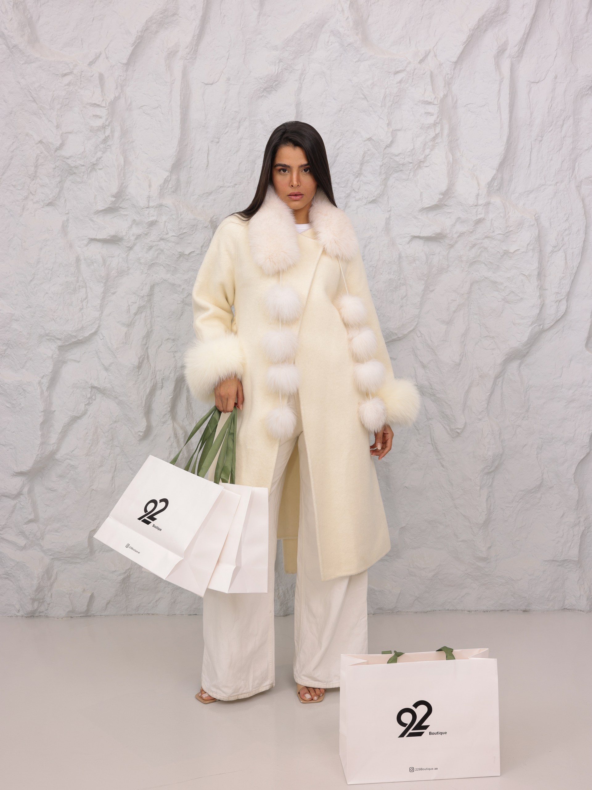 جاكيت شتوي فاخر بلون أوف وايت ناعم بتصميم راقٍ يجمع بين الأناقة والدفء. يتميز بتفاصيل الفرو الكثيف على الياقة والأكمام مع لمسة أنثوية جذابة من كرات الفرو المتدلية على الجانبين. خامته الفاخرة تمنح إحساسًا مريحًا وإطلالة شتوية فخمة مثالية للمناسبات المميزة
