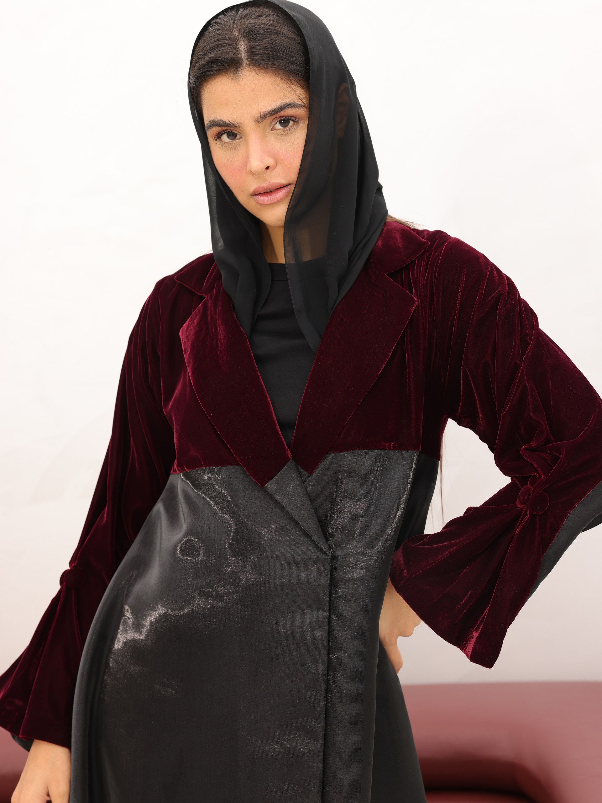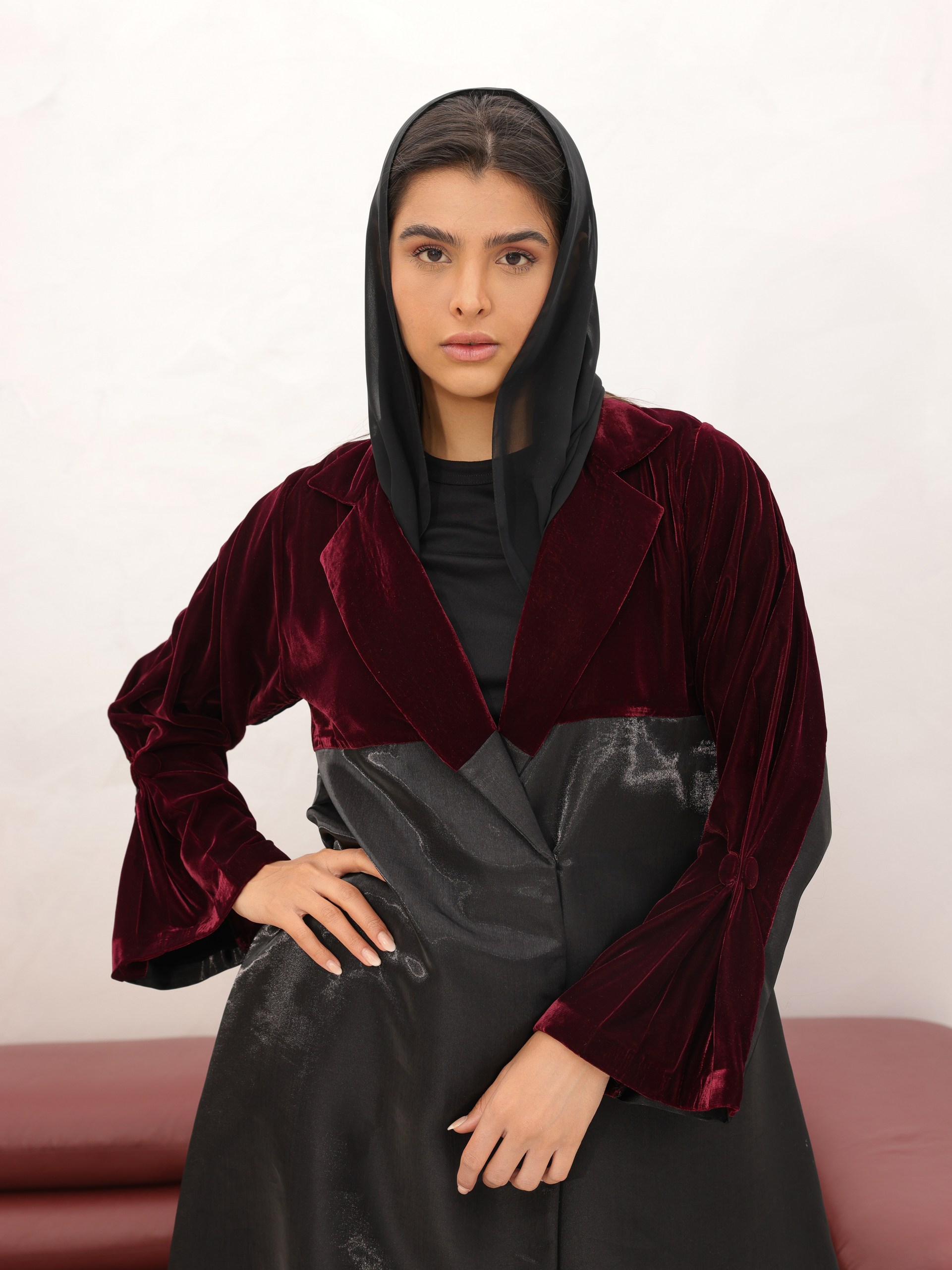 عباية أنيقة بخامة مخمل فاخرة بلون البرغندي العميق، تجمع بين الدفء والفخامة بأسلوب كلاسيكي راقي. تصميمها المميز ولمعتها الناعمة تضيف لمسة أنوثة وجمال لكل إطلالة، مثالية لأجواء الشتاء والمناسبات الخاصة