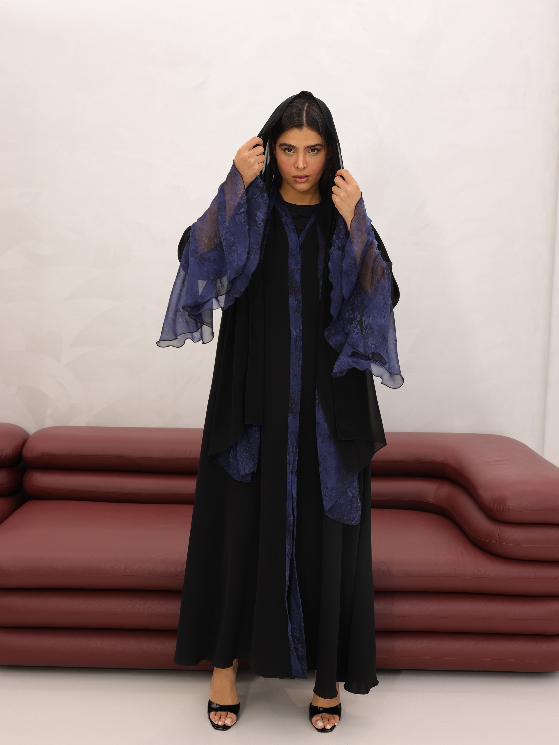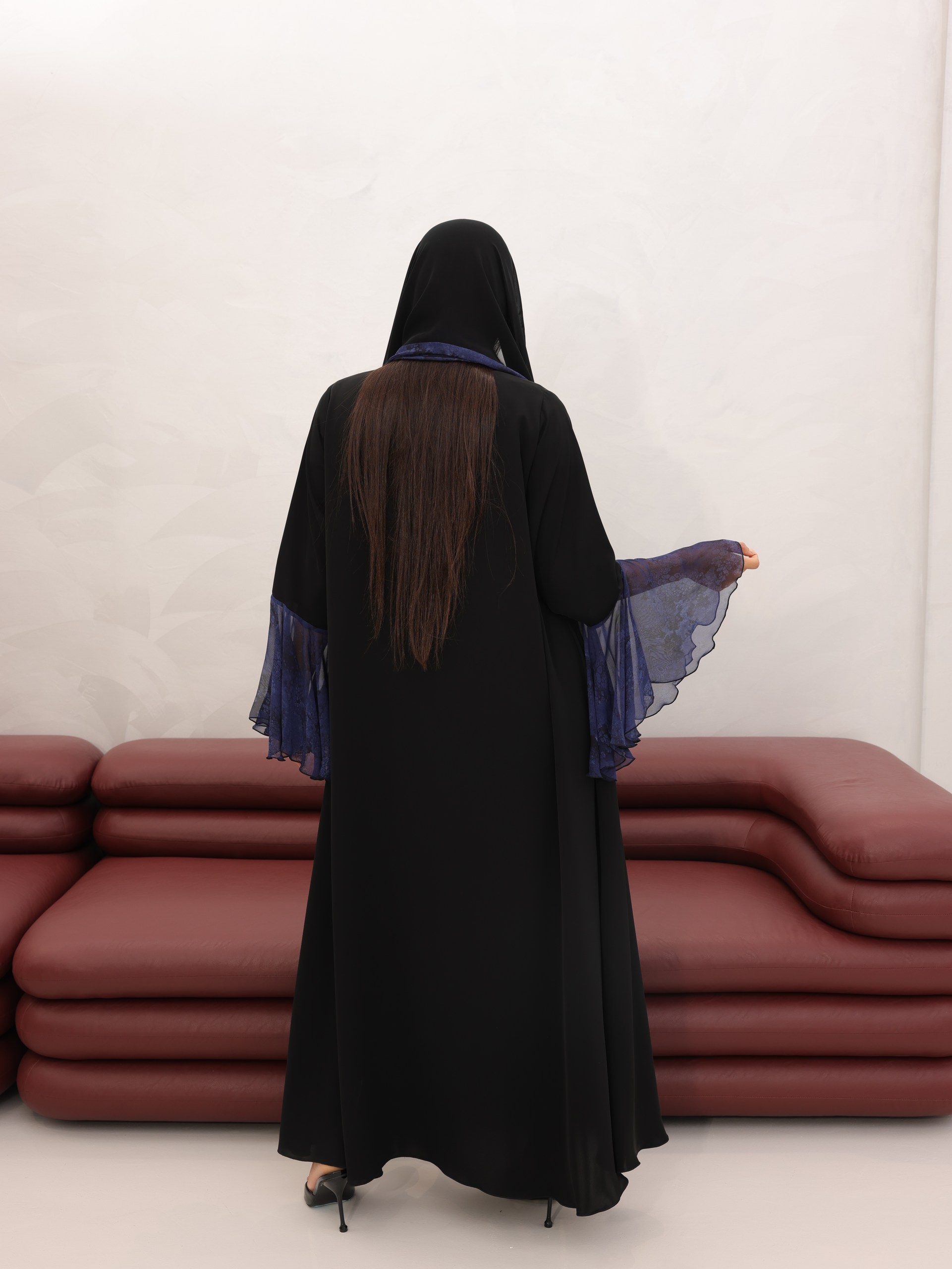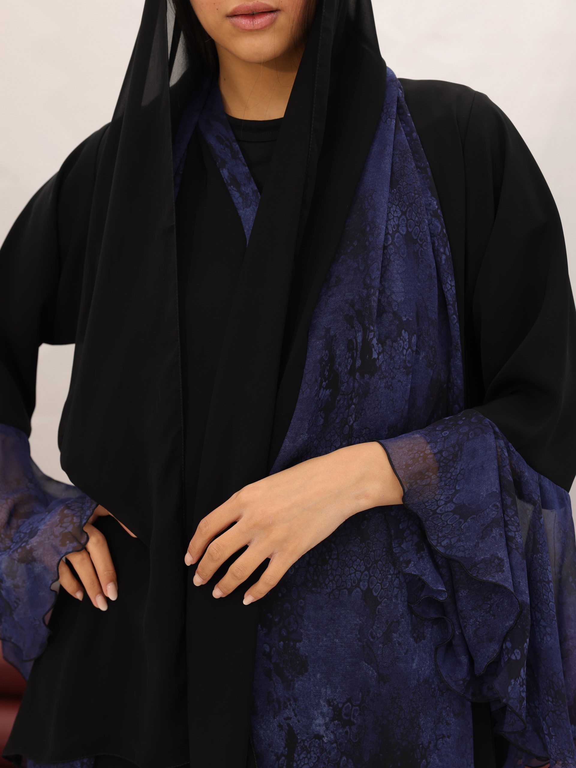عباية أنيقة بخامة ندى الفاخرة، بتصميم ناعم يميزها تفاصيل الشيفون الأزرق على الأكمام لإطلالة أنثوية فخمة. تجمع بين البساطة والفخامة بأسلوب